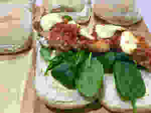 Butter buns. top with spinach leaves. Take pieces of the parmegiana and place in bun and serve.